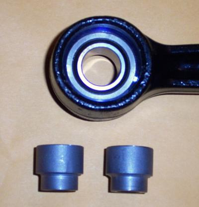 But it's not enough to just hog out a solid bushing and press that in there (or use a polyurethane bushing) as the suspension MUST pivot or the steering won't work. The solution is to press in a pair of spherical bearings. These are solid radially, but allow the arms to swing free.