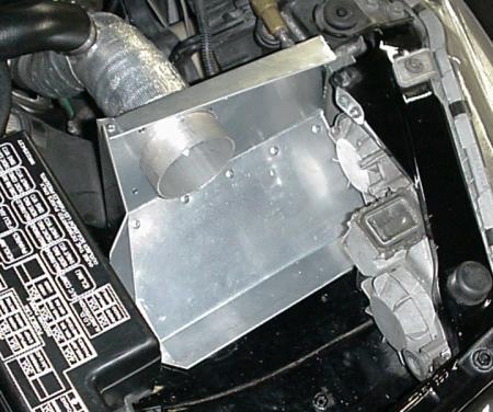 It's made of sheet aluminum, riveted together. It seals off the air intake area from the rest of the engine compartment. A strip of foam will be glued on top of the divider to seal it to the hood. I don't have a sheet metal brake, but a Workmate and a strip of angle iron works pretty well.
