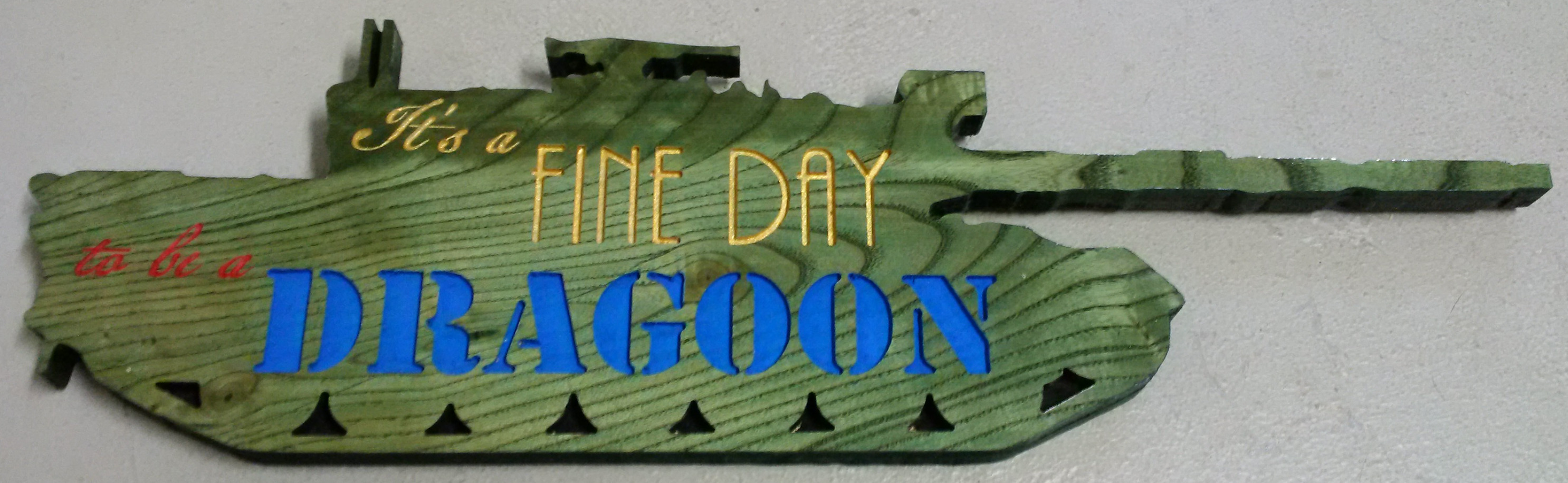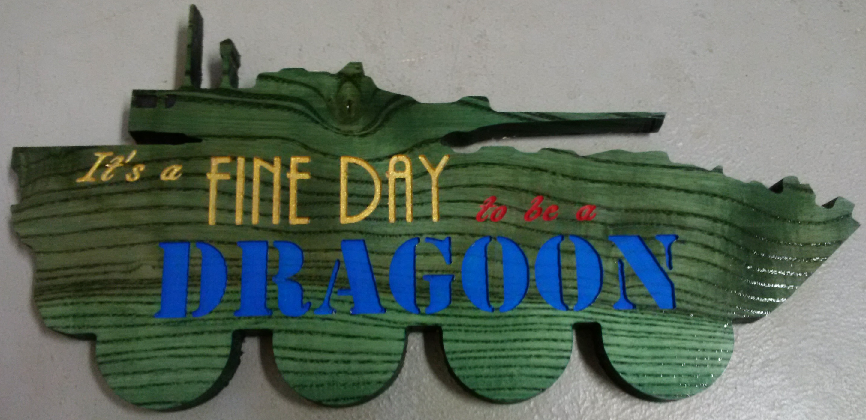 | It's a fine day to be a Dragoon! Show some regimental pride with the regimental toast superimposed on a Coyote outline. Usually made from ash, these pieces show a lot of grain and really pop.