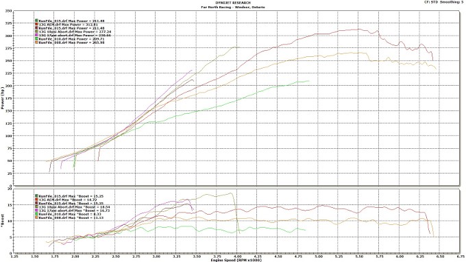 But here is where things got interesting: while tuning on the dyno, we started overrunning the MAF (or at least its calibration) and so couldn't set the max boost to where we wanted it. But we did get dyno pulls where all that was changed from run to run was the fixed duty cycle on the solenoid, showing the effect of the boost controller when set to different bleed amounts: