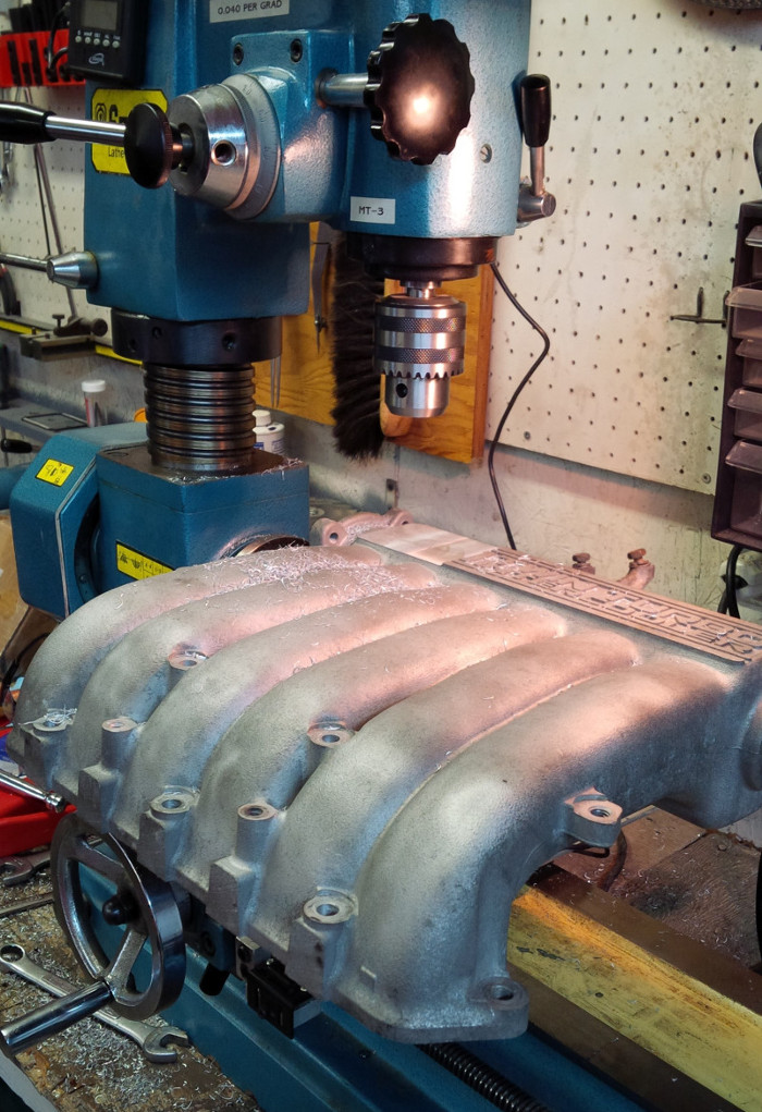 Next, the manifold needed ti be milled flat. An angle plate bolted to the table and the throttle body bolted to the angle plate produced a nice rigid setup (as rigid as my mill ever gets at least). I milled off the raised "ECU Multi" lettering on the casting so as to not reduce the casting wall thickness at all. This also exposed nice fresh metal for the weld.