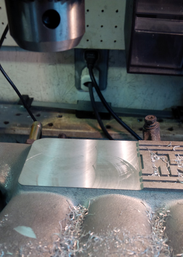 Figuring out how to do the underside was tricky, as I don't have a CNC mill (yet) nor a 4-jaw chuck for the lathe. By screwing an arbor to the hold-down screw hole, I was able to rotate the part around the screw-hole axis and round out the boss after roughing it out in the mill. Worked pretty well!