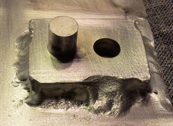 Here is the sensor snugged into the bore. That bore was drilled slightly undersize and then reamed out with a hand reamer. The production version wasn't reamed until after the weld was done.