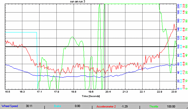 This is a log of the turnaround at the 2002 Ft Myers ProSolo. The dark blue line is wheel speed. The red line is lateral G. The green line is throttle position, and the light blue line is brakes on/off. The horizontal black line is 0G lateral, and the vertical black line is the cursor, at which you can read the values of the various traces below the graph.